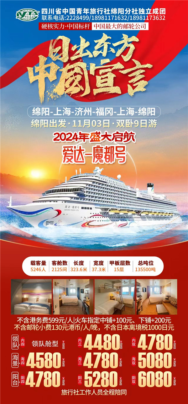 綿陽中旅假日旅行社于2024年10月9日在市工會(huì)大廈成功舉行“愛達(dá)·魔都號(hào)豪華郵輪9日游”旅游線路推薦會(huì)?,F(xiàn)場(chǎng)主持人向到場(chǎng)的嘉賓們?cè)敿?xì)的介紹了濟(jì)州、福岡等地的風(fēng)土人民、美食、美景以及出游的相關(guān)注意事項(xiàng)等內(nèi)容,受到了嘉賓們的熱烈歡迎和關(guān)注。服務(wù)熱線:0816-2228499/2238477 。